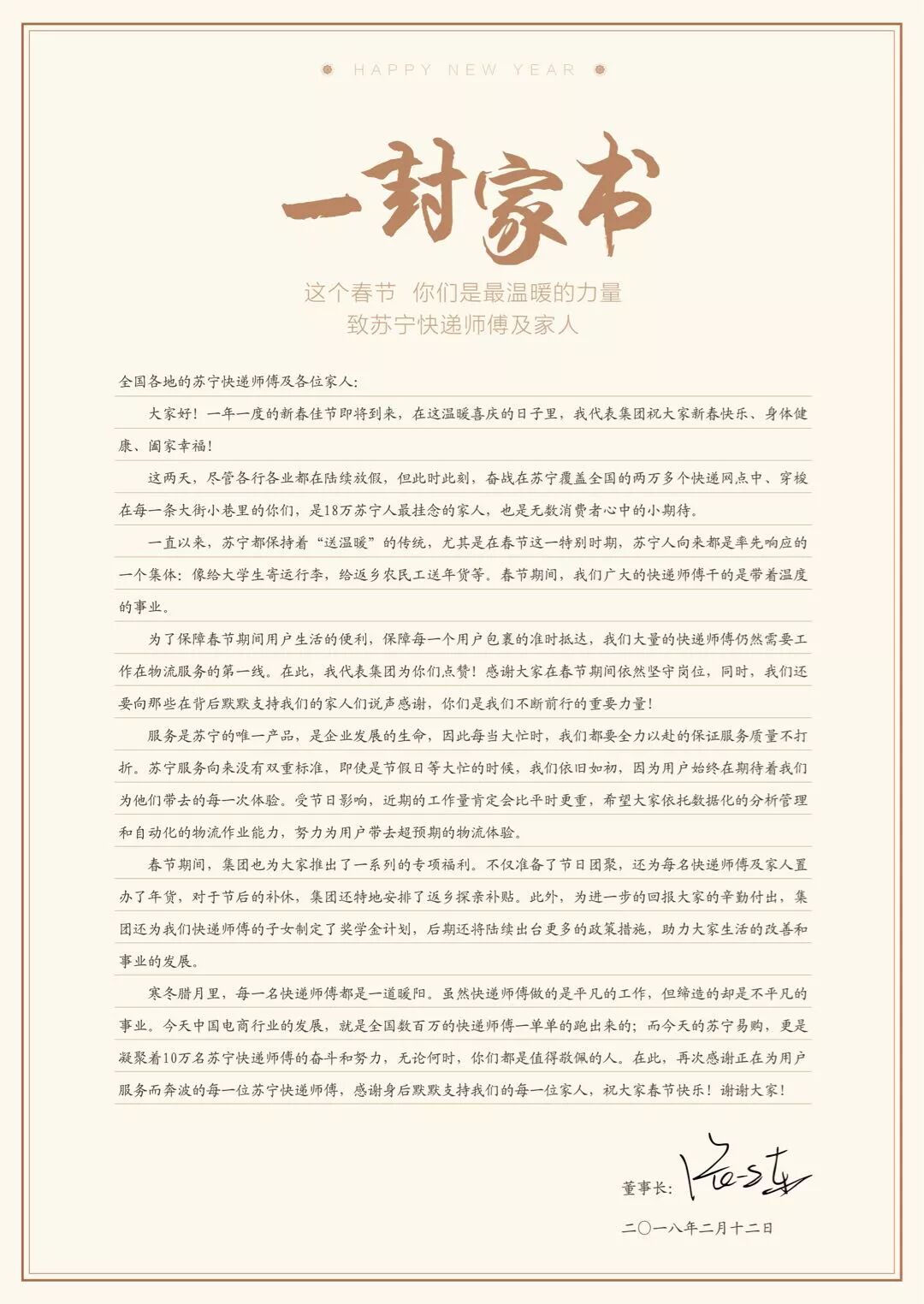这群在万家团圆的时刻离家忙碌的快递小哥们,最让张近东牵挂,他专门写下一封情真意切的家书,“我代表集团为你们点赞!感谢大家在春节期间依然坚守岗位,同时,我们还要向那些在背后默默支持我们的家人们说声感谢,你们是我们不断前行的重要力量!”
